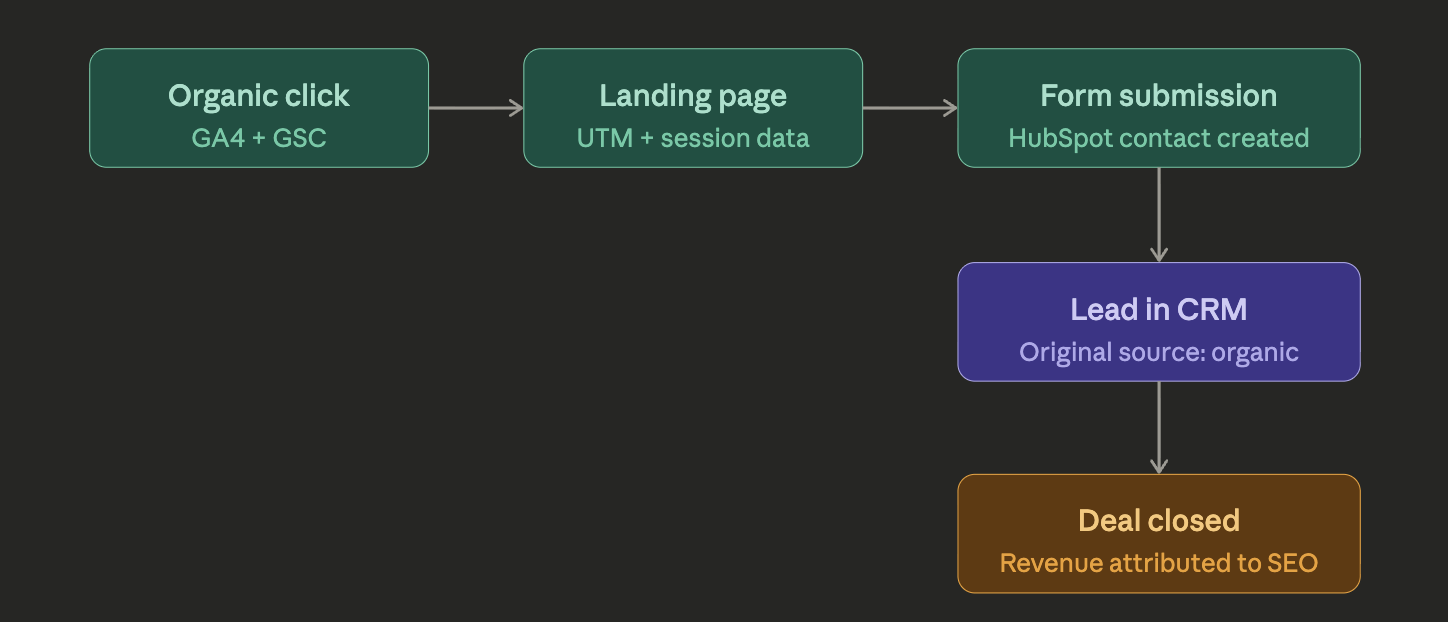 This is where most Webflow SEO engagements fail. The technical work gets done. Rankings improve. Traffic grows. But when the CMO asks for a revenue figure, the SEO team pulls up organic sessions while the sales team looks at CRM data that says "source unknown" for half their deals.